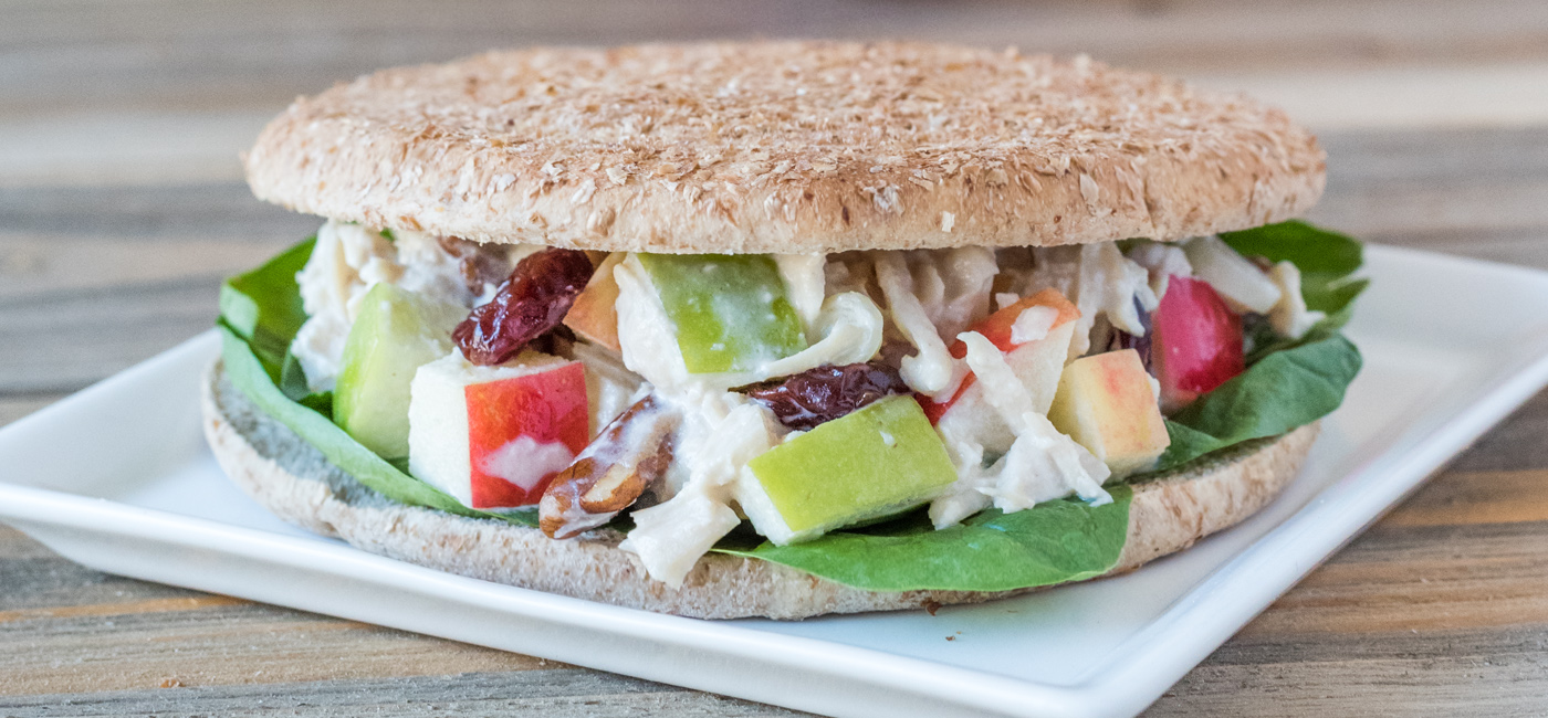 - Top each with a scoop of apple chicken salad and a Sandwich Thins roll lid.