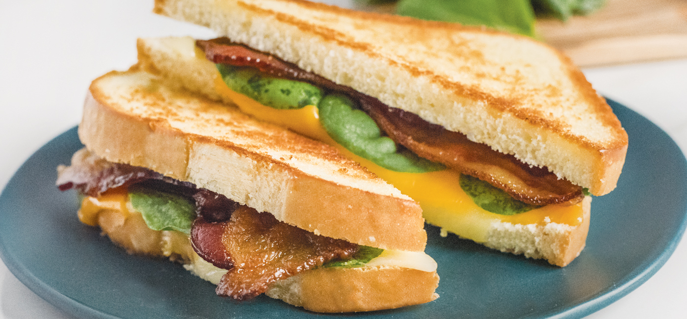 - Top with cheese slices, followed by spinach, bacon and second bread slice, butter side up.