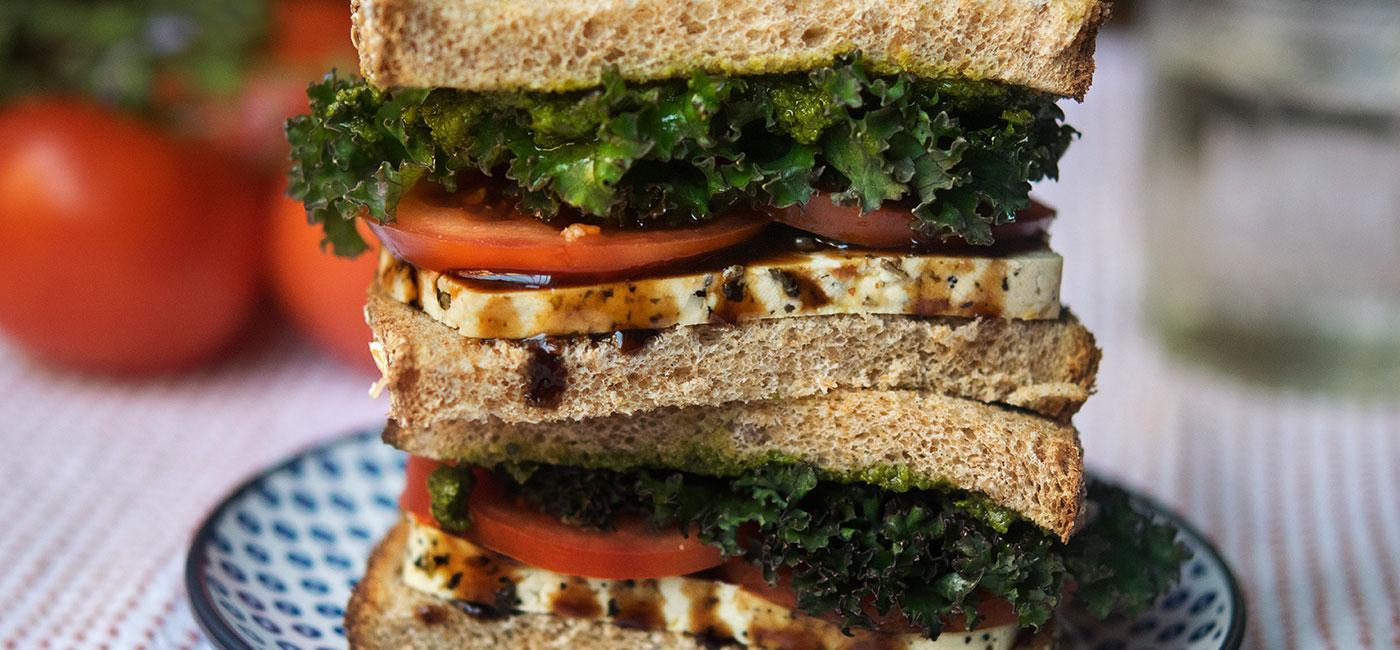 - Top with tomato slices, kale and the additional sliced of bread.