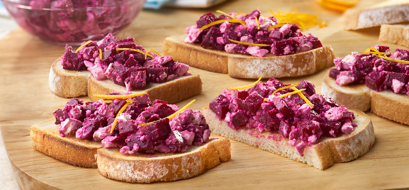- Place beet and cheese mixture on 4 slices of toasted bread and top with orange zest.