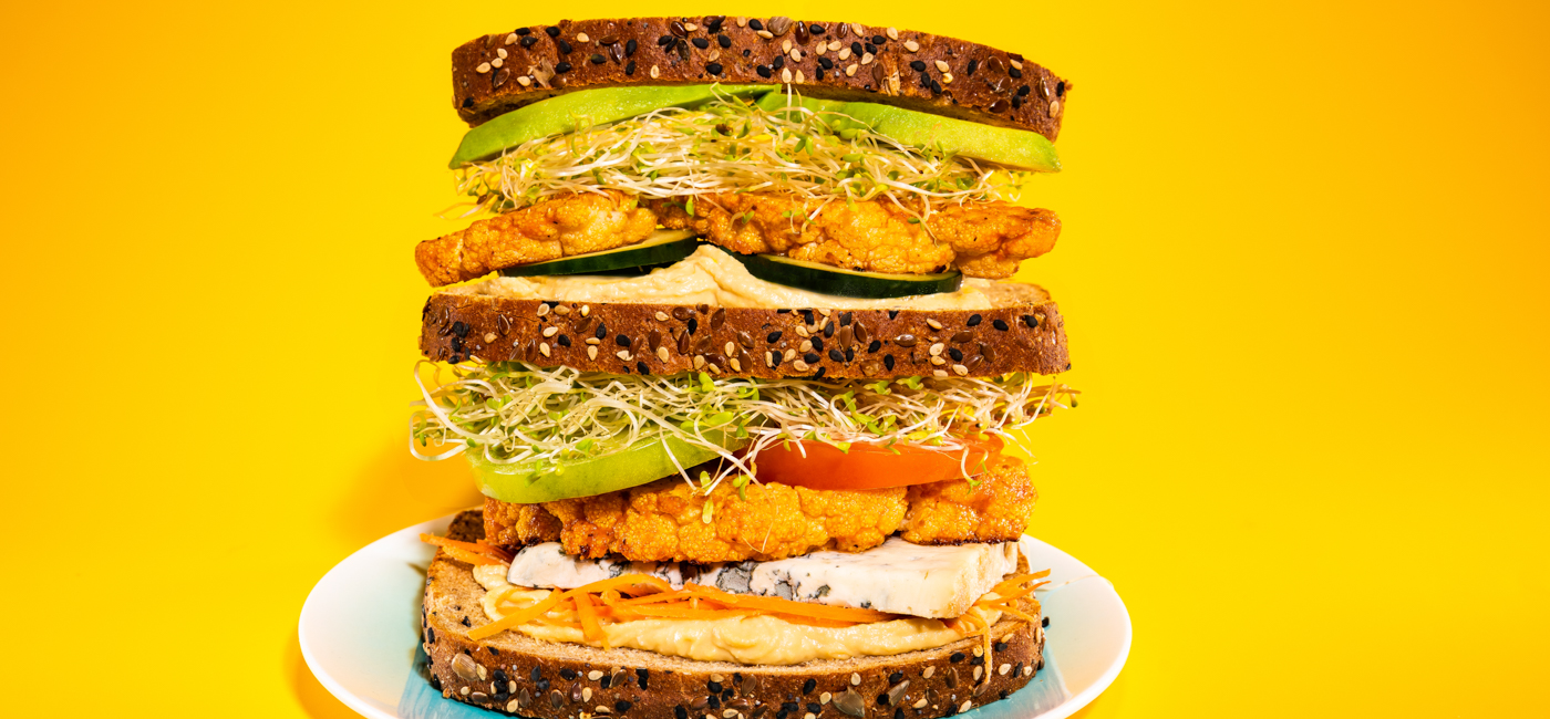 - On a slice of bread, spread 2 tbsp hummus, then top with grated carrots, a blue cheese slice, buffalo cauliflower, tomato slices, and sprouts.