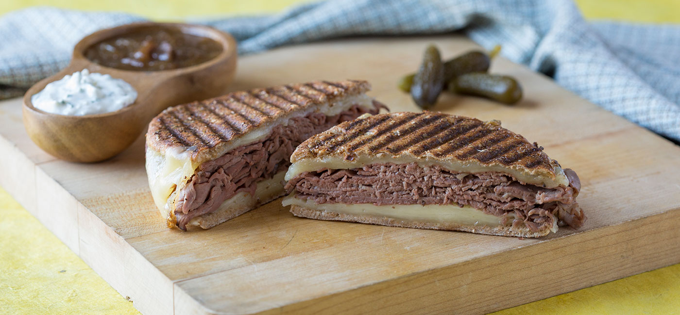 - Slice sandwich in half and serve immediately with onion jus and yogurt-horseradish dipping sauce on the side for dipping.