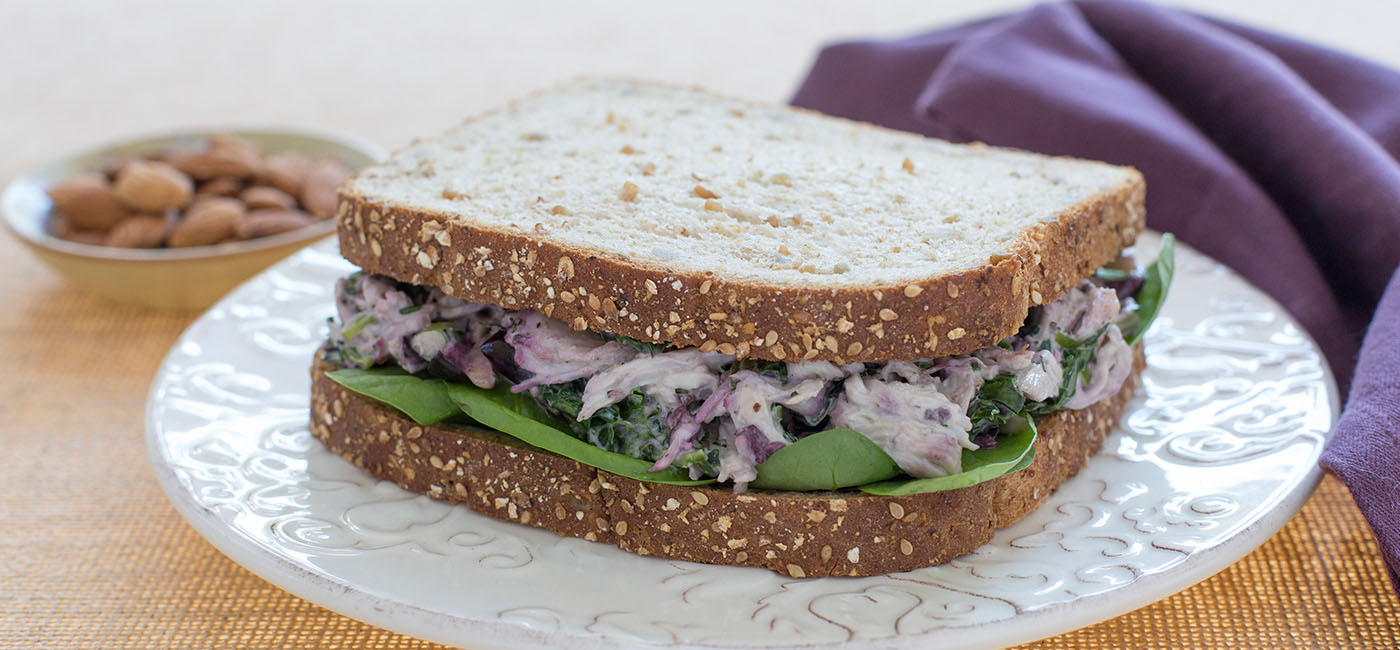 - Evenly split up the chicken salad and gently press it down over the spinach to conform to the shape of the bread.