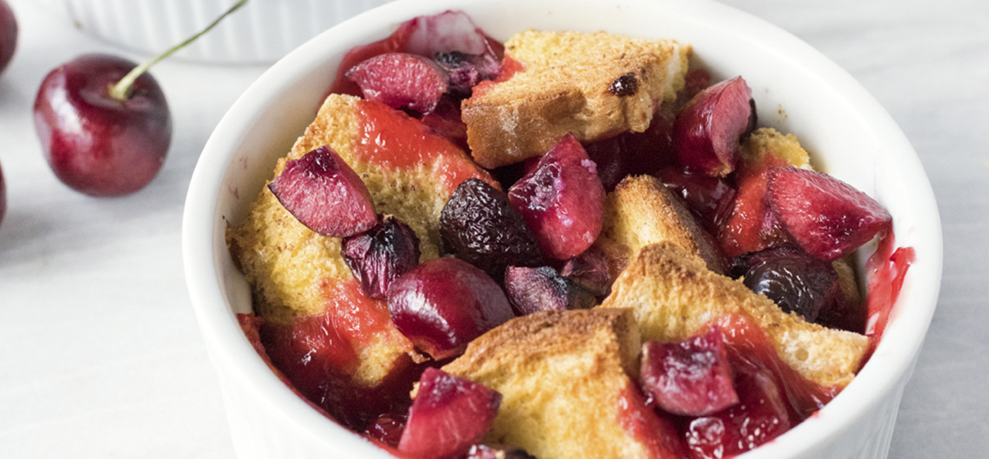 - Top with remaining bread cubes, and a second layer of cherry pie filling and cherries.