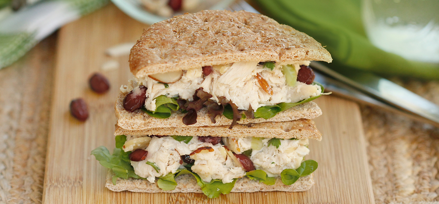 - In a large bowl, combine Greek yogurt, hummus, chicken, celery, almonds and cranberries.