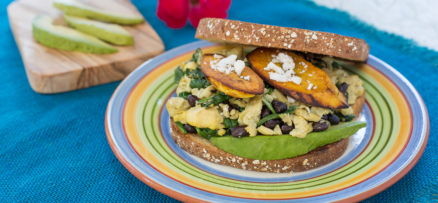 - Top this with half of the scrambled egg and bean mixture, half of the sliced plantains, and half of the crumbled queso fresco. Finally, top with another piece of bread.