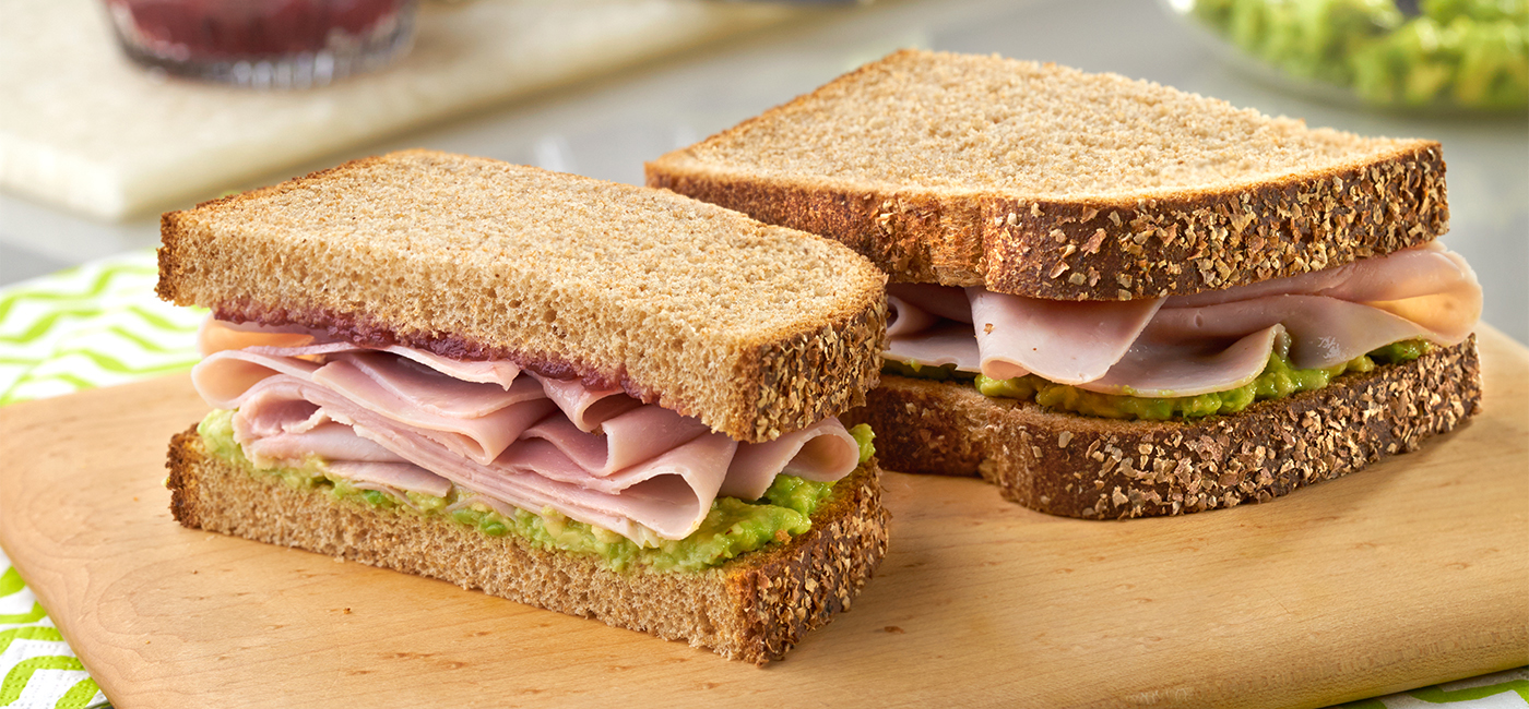- Layer ham over the avocado and place the cranberry slice of bread on top, sauce-side down.