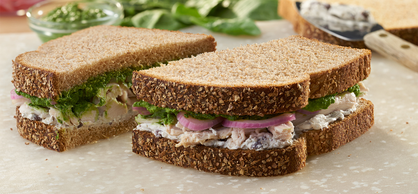 - Spread mixture on one slice of bread and the spinach pesto on another slice.