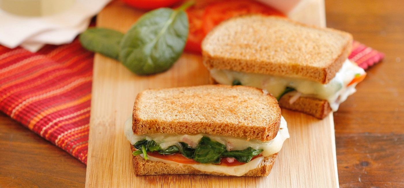 - Top one of the slices of bread with a slice of fontina cheese, tomato, spinach and another slice of fontina cheese.