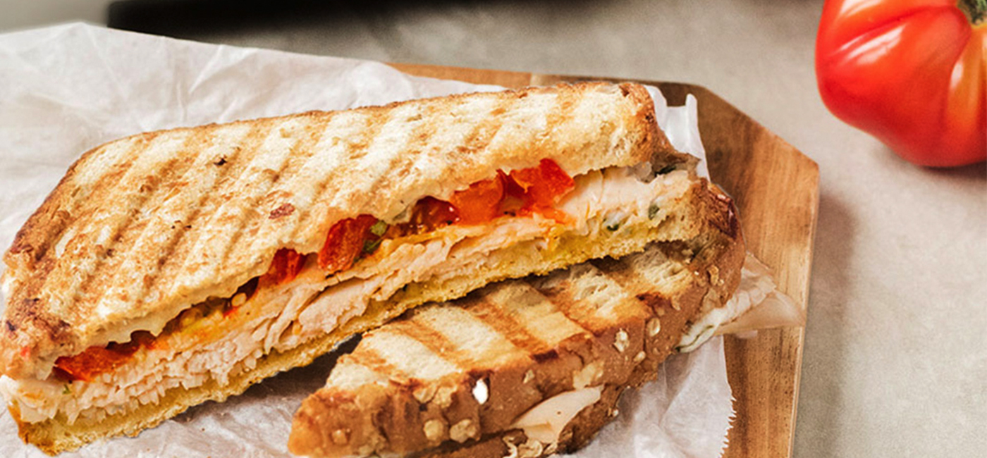 - Cook sandwich in panini press until golden brown (approximately 3 minutes).