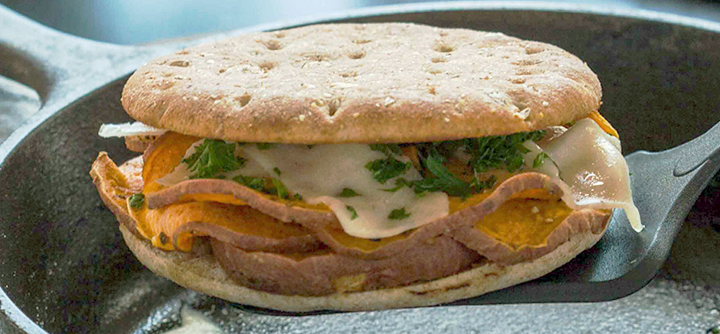 - Layer the precooked yam slices, parmesan cheese, fresh ground black pepper, drizzled honey, to taste, and watercress on the bread slice.