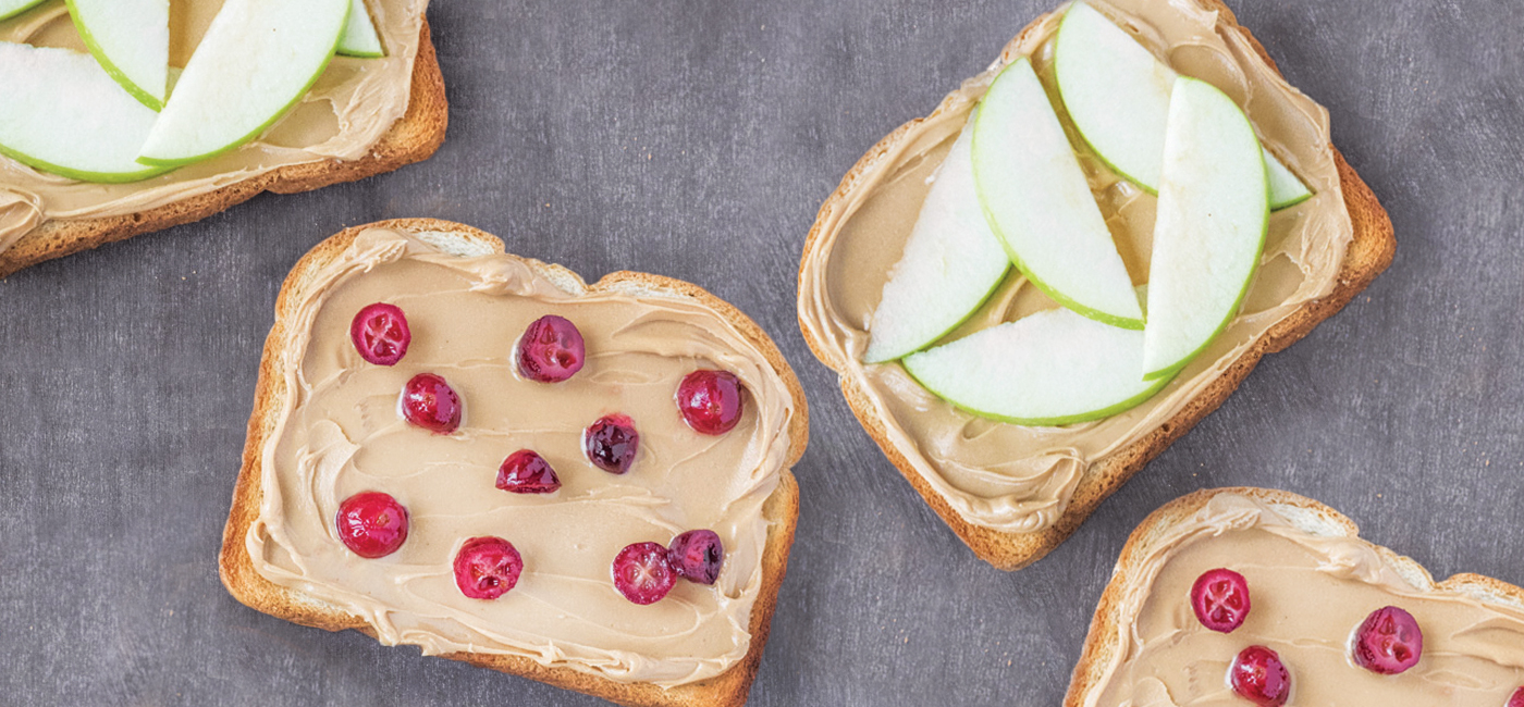 - Top the first slice of bread with apples, the second with sweetened cranberries and the third with your favorite topping.