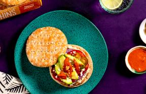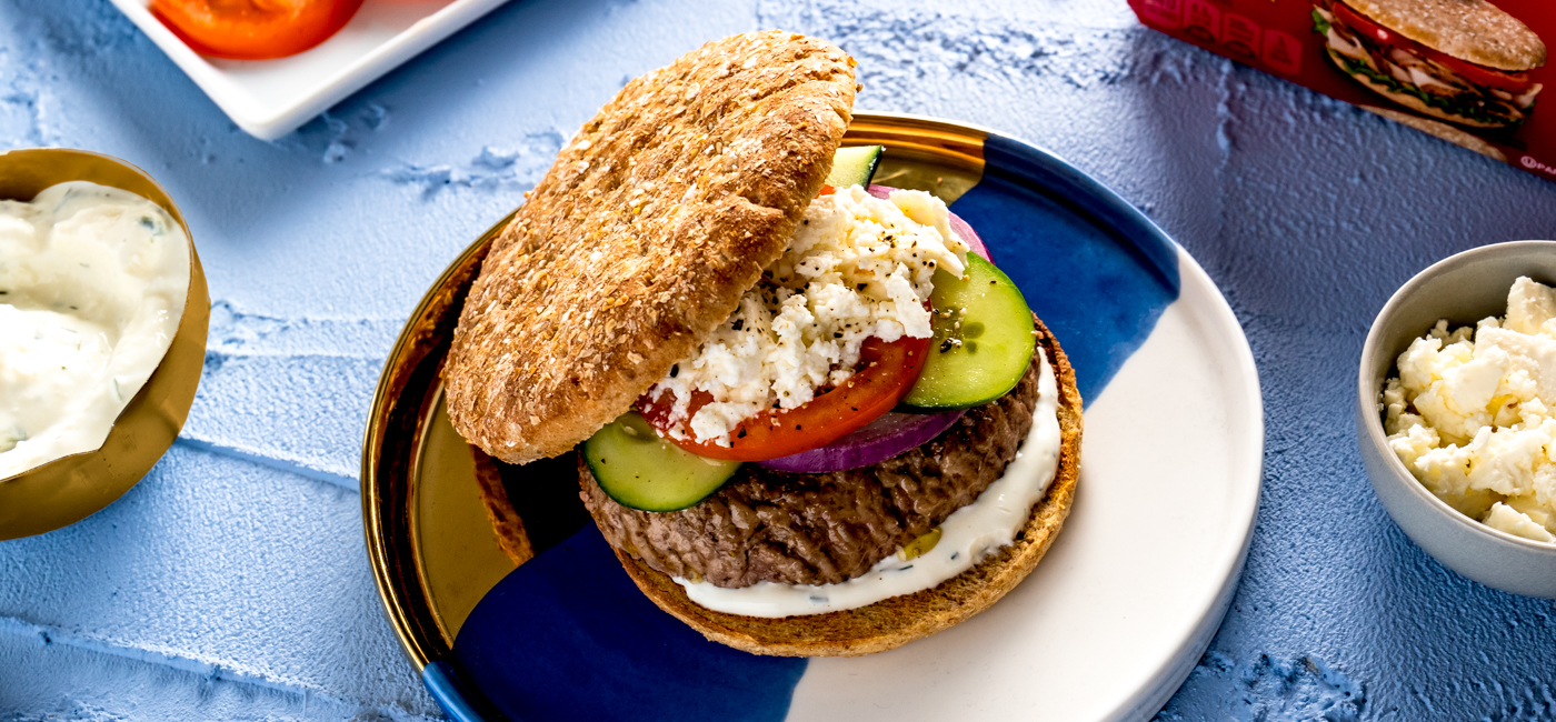 - Spread Sandwich Thins rolls with Tzatziki sauce, then top with lamb burger, sliced tomato, sliced cucumber, and feta.