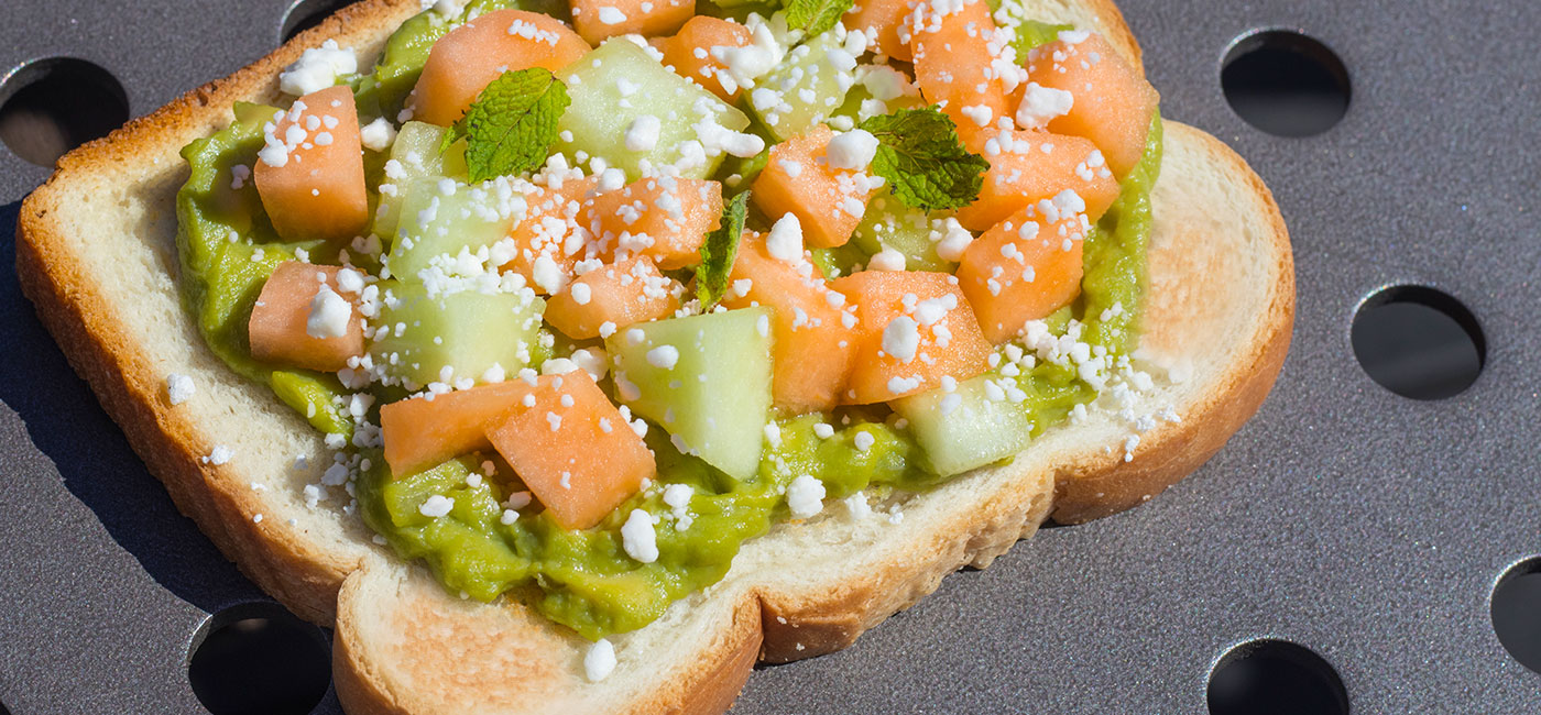 - Spread avocado mash on bread slice and top with honeydew and cantaloupe pieces.