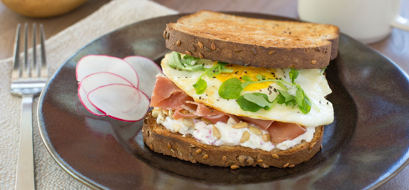 - Top each with half the sunflower kernels, half the prosciutto strips and a over easy egg.