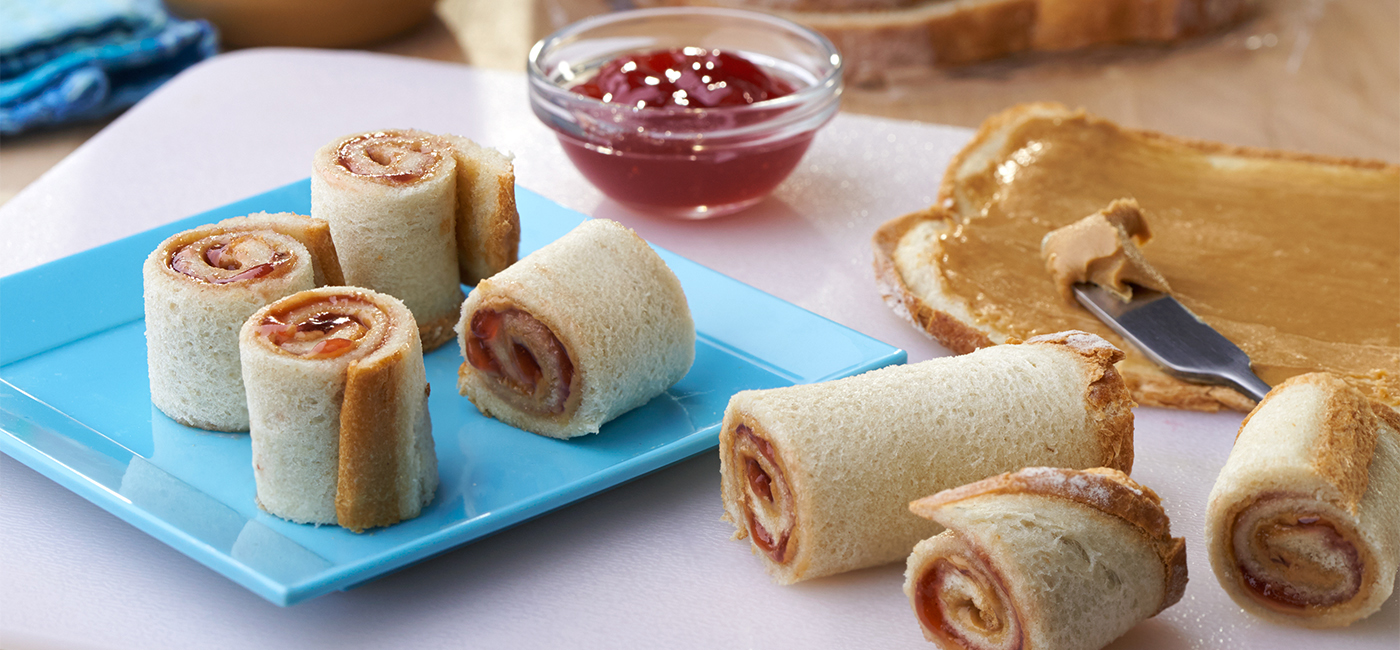 - Spread peanut butter and jelly on both slices of bread, leaving a one-inch space on one end.