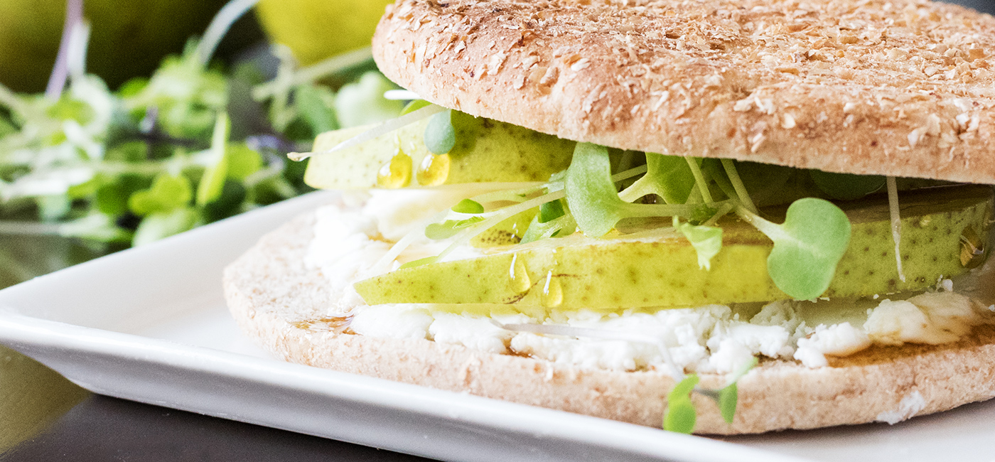 - Place the pear slices on top of the cheese, followed by the microgreens.