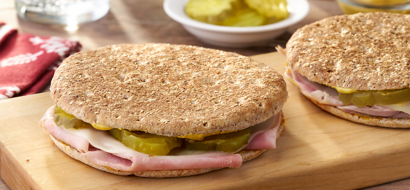 - Split all ingredients evenly onto one side of the Sandwich Thins roll, beginning with mustard, ham, cheese and pickles.