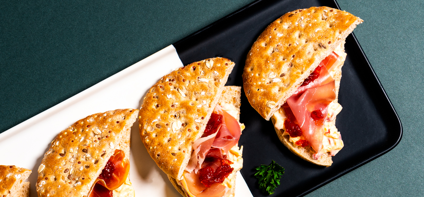 - Add a dollop of pepper jelly and finish with Sandwich Thins rolls top half.