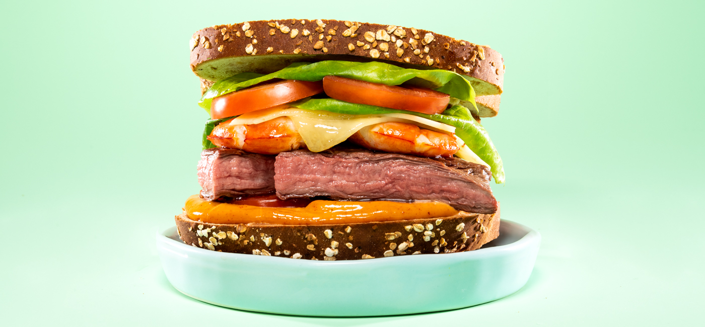 - Divide the sliced steak among the two slices and top each with 3 shrimp, cheese, tomato slices, and lettuce.