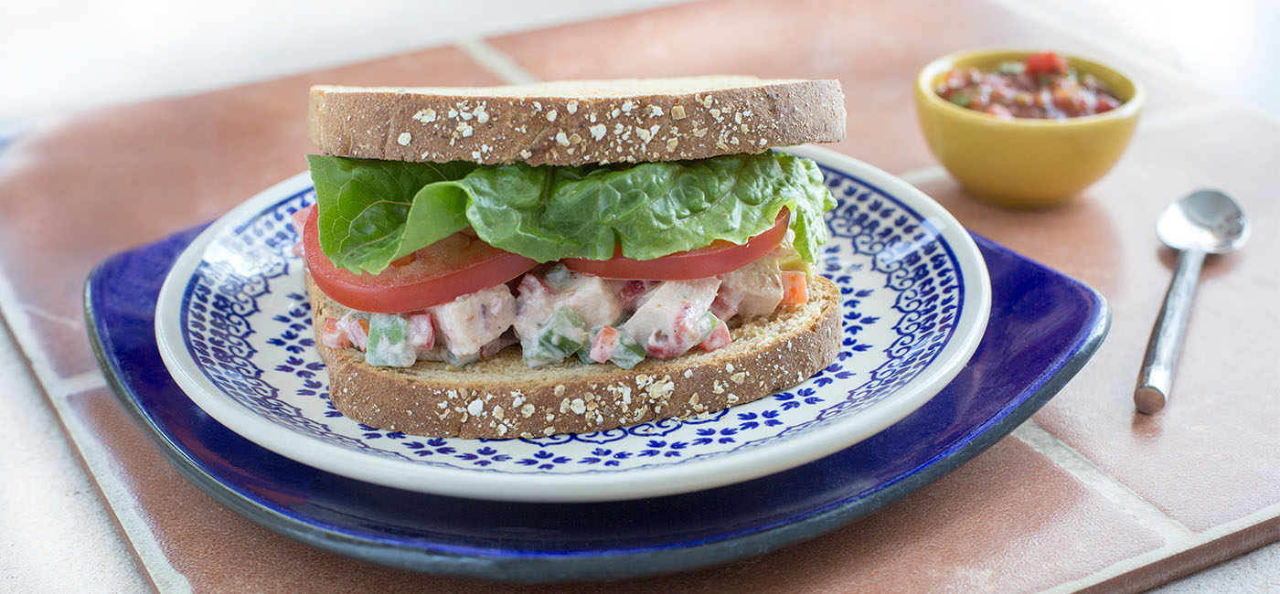 - Lightly toast bread and divide chicken salad mixture between two slices of the bread.