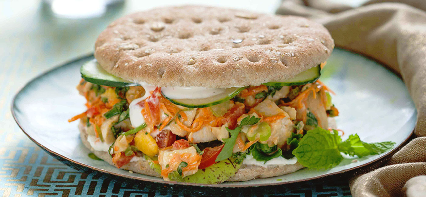 - Top each with 1/2 the chicken mixture and cucumber slices.