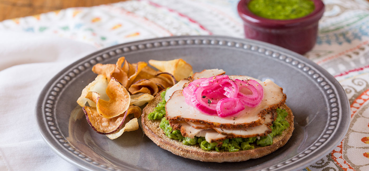 - Divide the peas, onion, pesto, and turkey among the rolls, serve open faced.